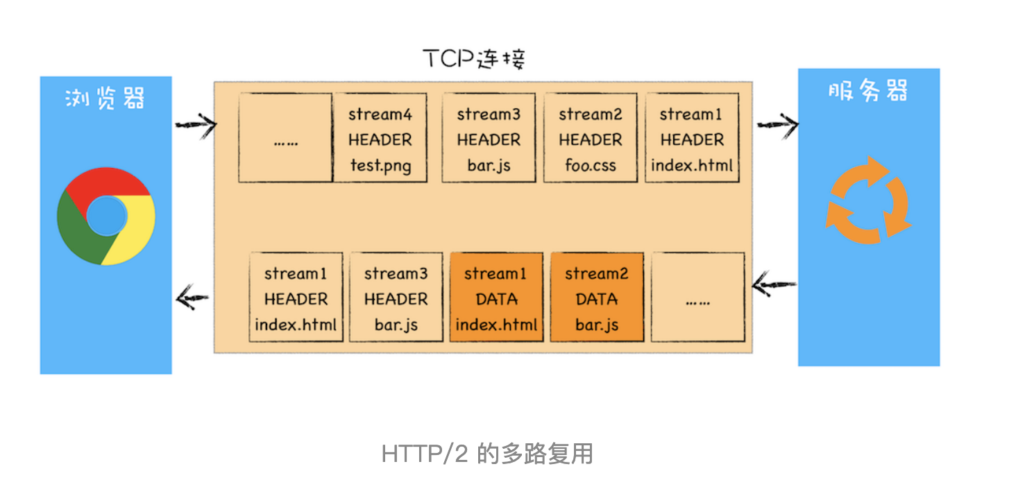 该图就是 HTTP/2 最核心、最重要且最具颠覆性的多路复用机制。从图中你会发现每个请求都有一个对应的 ID,如 stream1 表示 index.html 的请求,stream2 表示 foo.css 的请求。这样在浏览器端,就可以随时将请求发送给服务器了。
