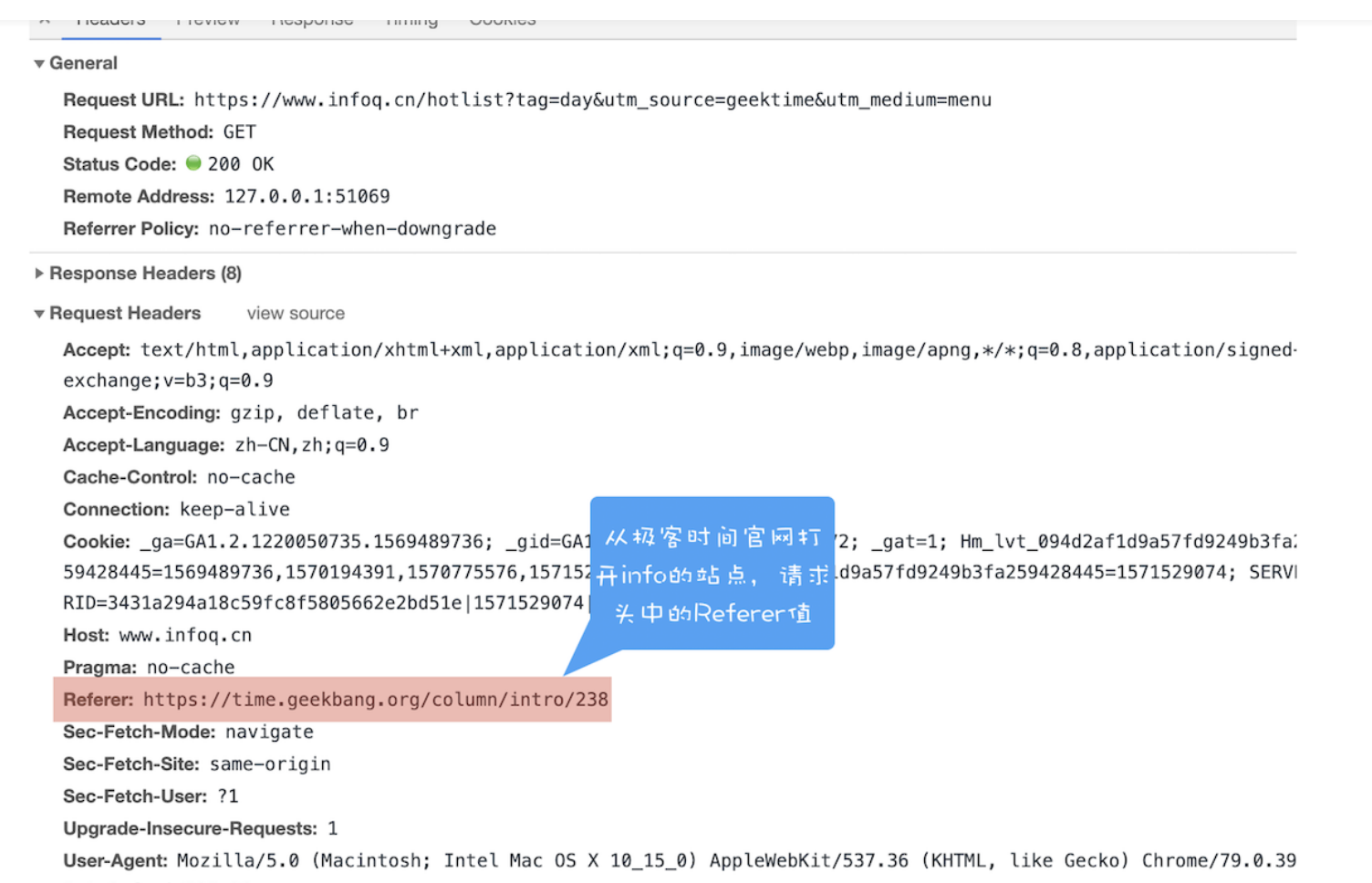 Referer 是 HTTP 请求头中的一个字段,记录了该 HTTP 请求的来源地址。比如我从极客时间的官网打开了 InfoQ 的站点,那么请求头中的 Referer 值是极客时间的 URL,如下图: