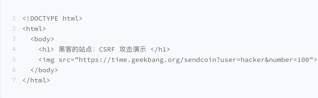 这是黑客页面的 HTML 代码,在这段代码中,黑客将转账的请求接口隐藏在 img 标签内,欺骗浏览器这是一张图片资源。当该页面被加载时,浏览器会自动发起 img 的资源请求,如果服务器没有对该请求做判断的话,那么服务器就会认为该请求是一个转账请求,于是用户账户上的 100 极客币就被转移到黑客的账户上去了。
