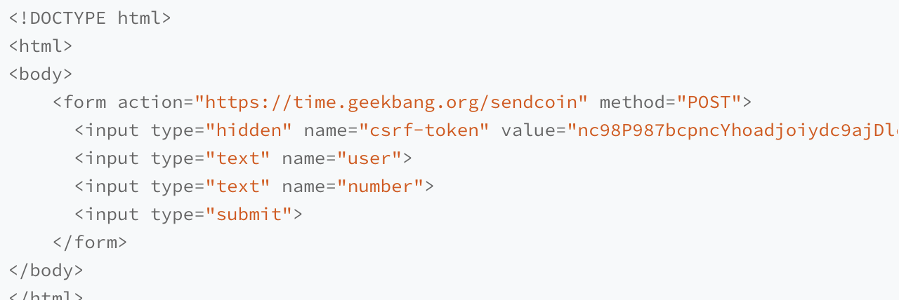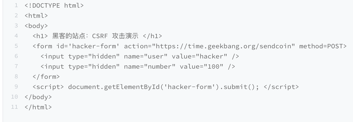 以上三种就是黑客经常采用的攻击方式。如果当用户登录了极客时间,以上三种 CSRF 攻击方式中的任何一种发生时,那么服务器都会将一定金额的极客币发送到黑客账户。