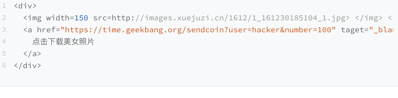 这段黑客站点代码,页面上放了一张美女图片,下面放了图片下载地址,而这个下载地址实际上是黑客用来转账的接口,一旦用户点击了这个链接,那么他的极客币就被转到黑客账户上了。